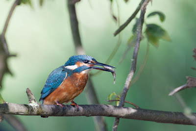 After perhaps 10 minutes a blue dart shot across me to the trees. Another slow pan round and bingo! My best ever views of a kingfisher. Frustratingly the hide was showing as a dark blob in the background, more evident when I got home